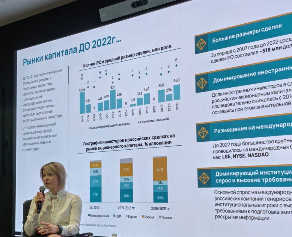 В рамках первой дискуссии Юлия представила анализ трансформации российских рынков капитала и изменений, произошедших после 2022 года. Юлия отметила, что до 2022 года российский рынок IPO был глубоко интегрирован в глобальную финансовую систему: крупные размещения проходили на международных площадках, а основной спрос формировали иностранные институциональные инвесторы. Средний размер сделок достигал порядка $500 млн, а требования к раскрытию и корпоративному управлению соответствовали международным стандартам.